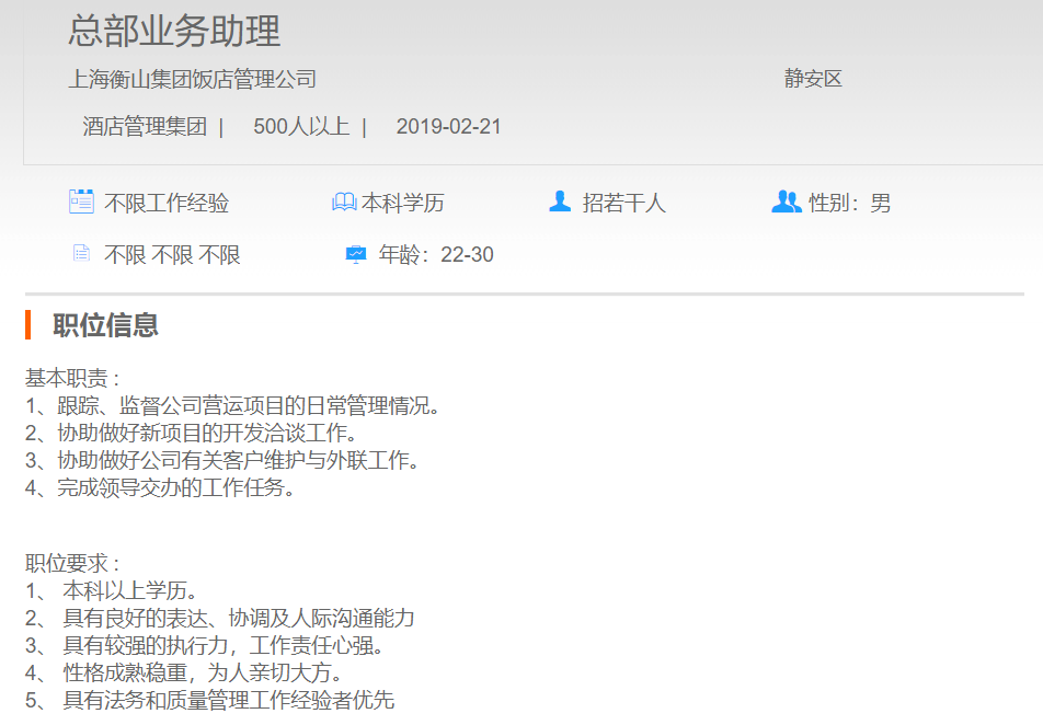 上海衡山集团饭店管理公司总部业务助理
