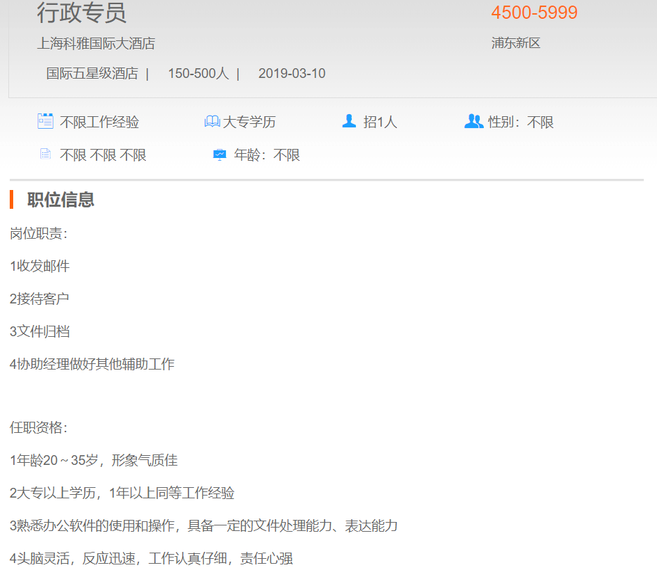 上海科雅国际大酒店行政专员