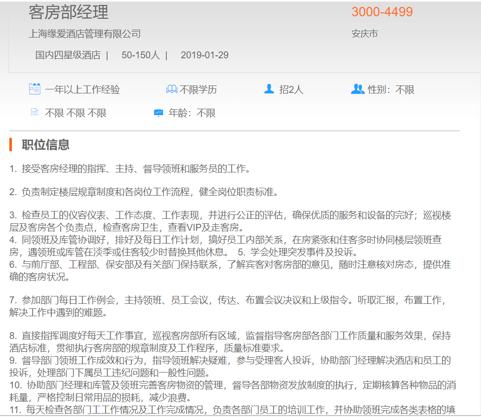 上海缘爱酒店管理有限公司客房部经理