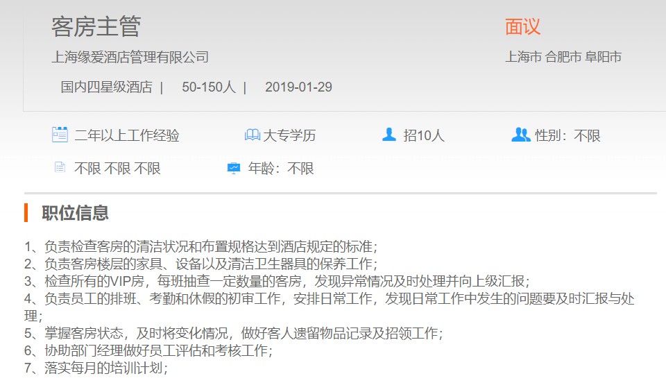 上海缘爱酒店管理有限公司客房主管