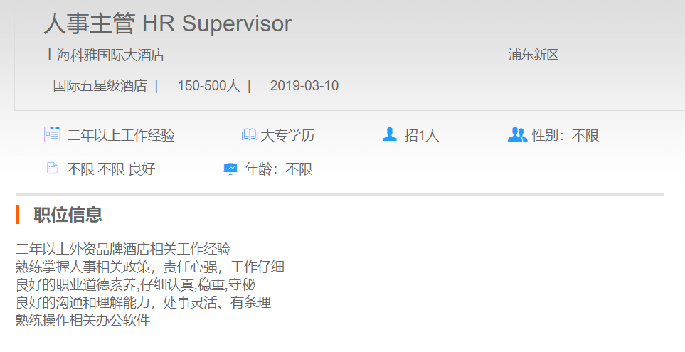 上海科雅国际大酒店人事主管