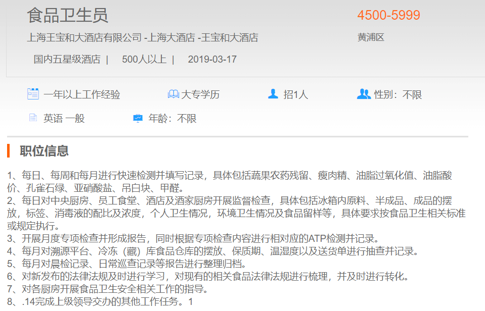 上海王宝和大酒店有限公司食品卫生员