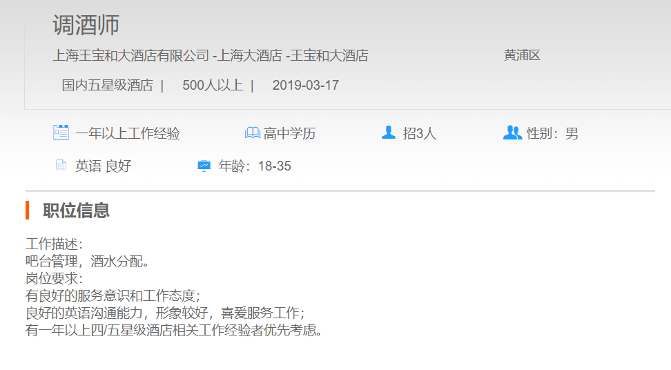 上海王宝和大酒店有限公司调酒师