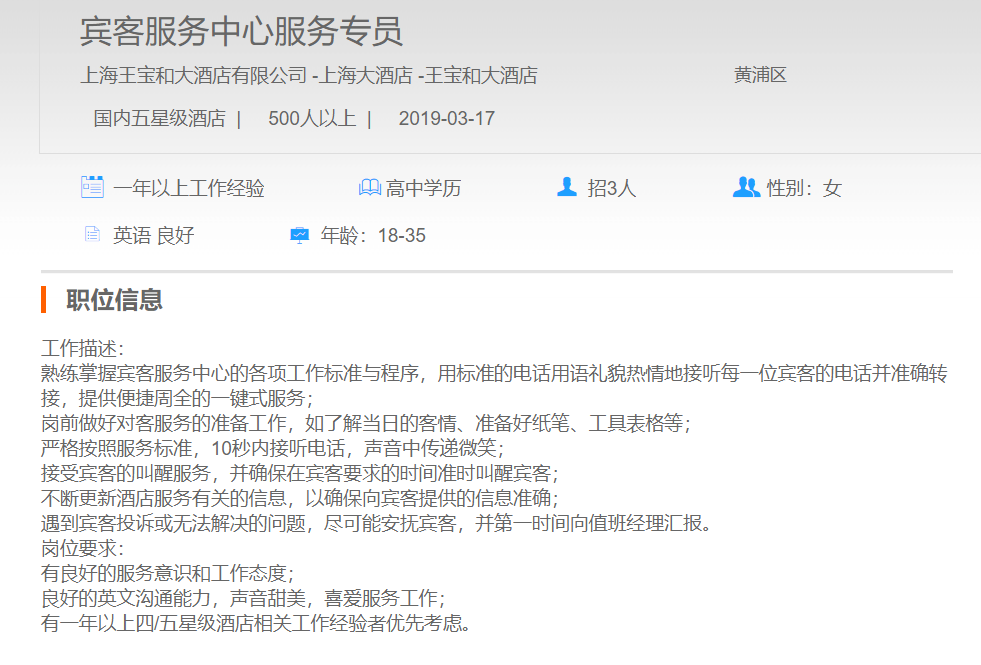 上海王宝和大酒店有限公司宾客服务中心服务专员