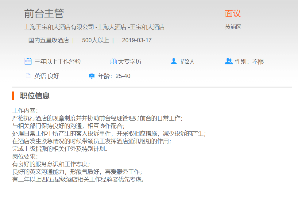 上海王宝和大酒店有限公司前台主管