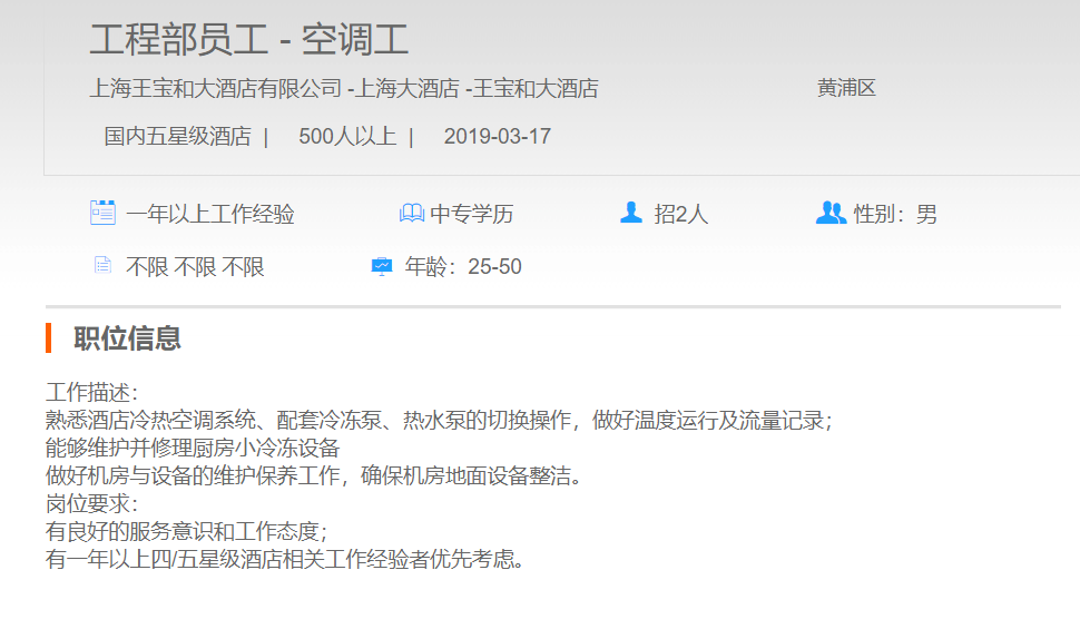 上海王宝和大酒店有限公司工程部员工