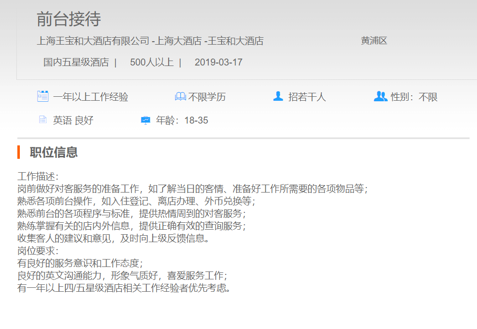 上海王宝和大酒店有限公司前台接待