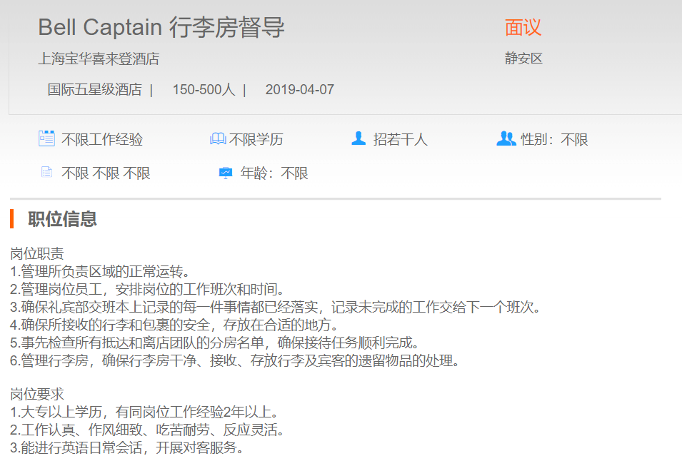 上海宝华喜来登酒店行李房督导