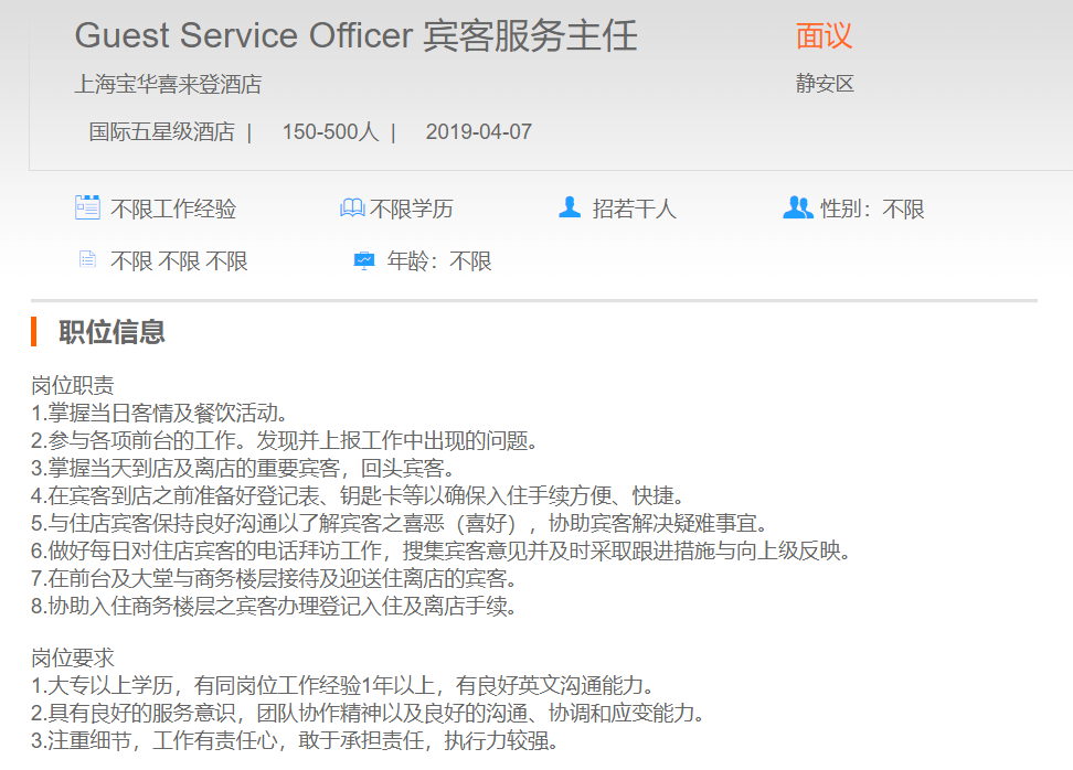 上海宝华喜来登酒店宾客服务主任