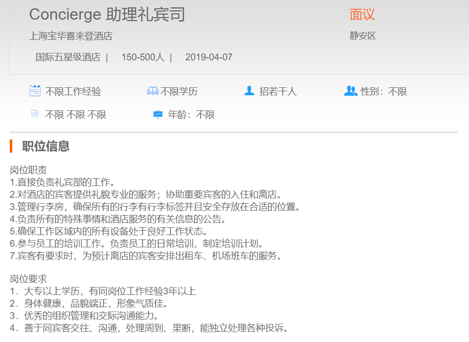 上海宝华喜来登酒店助理礼宾司