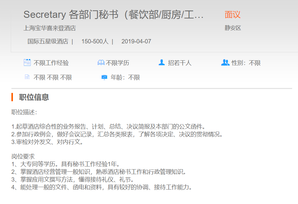 上海宝华喜来登酒店各部门秘书