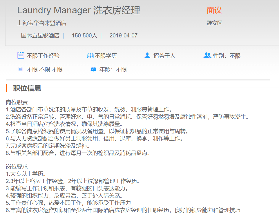 上海宝华喜来登酒店洗衣房经理