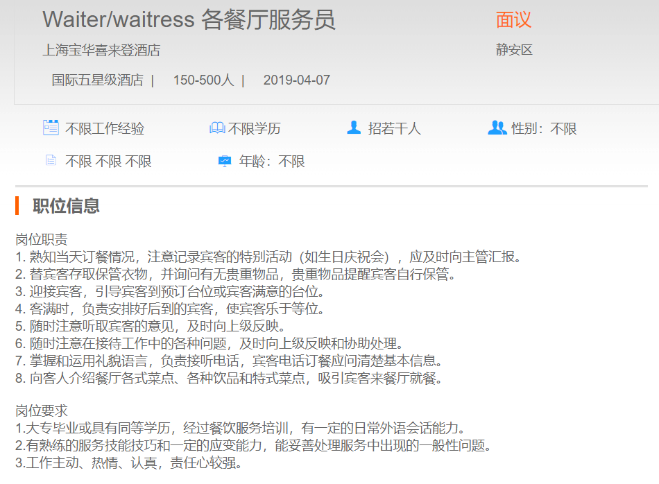 上海宝华喜来登酒店各餐厅服务员