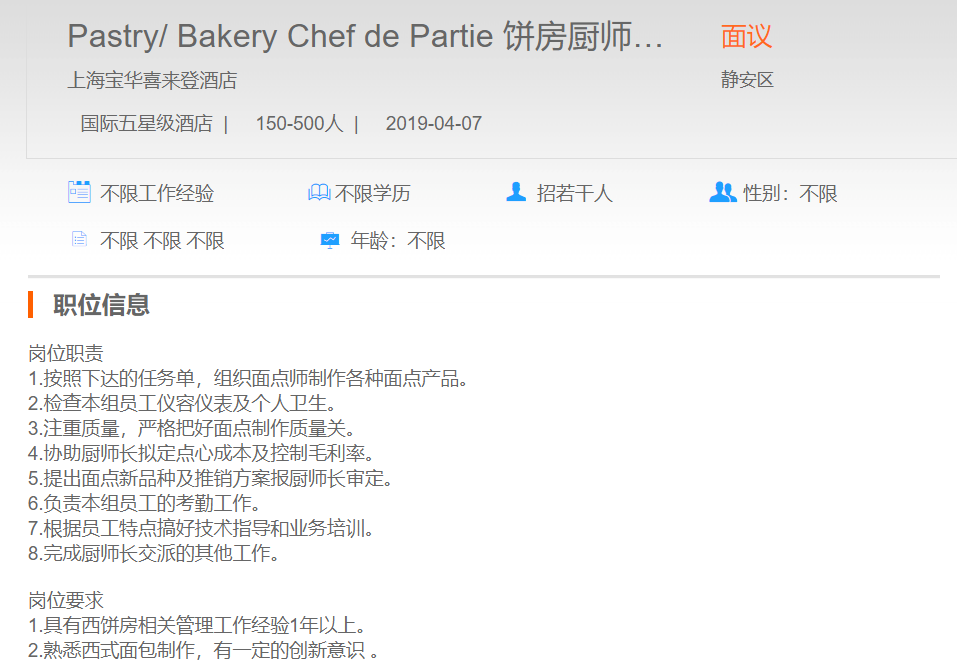 上海宝华喜来登酒店饼房厨师主管