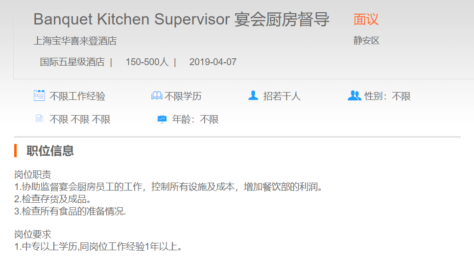 上海宝华喜来登酒店宴会厨房督导