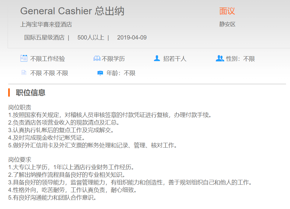 上海宝华喜来登酒店总出纳