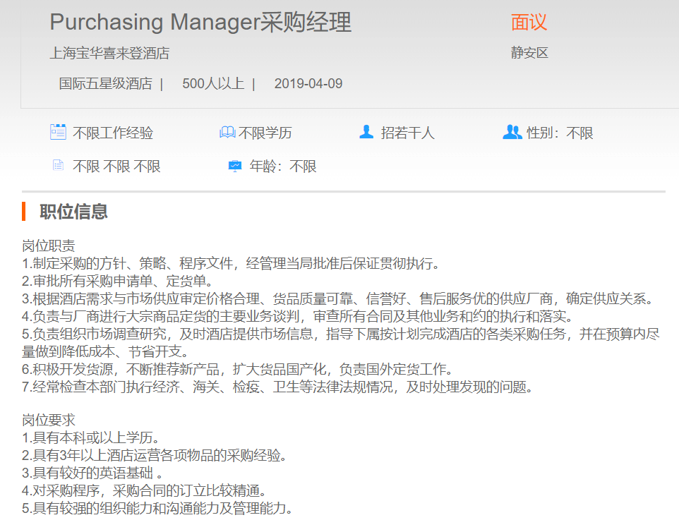 上海宝华喜来登酒店采购经理