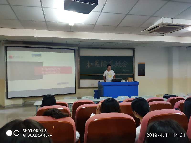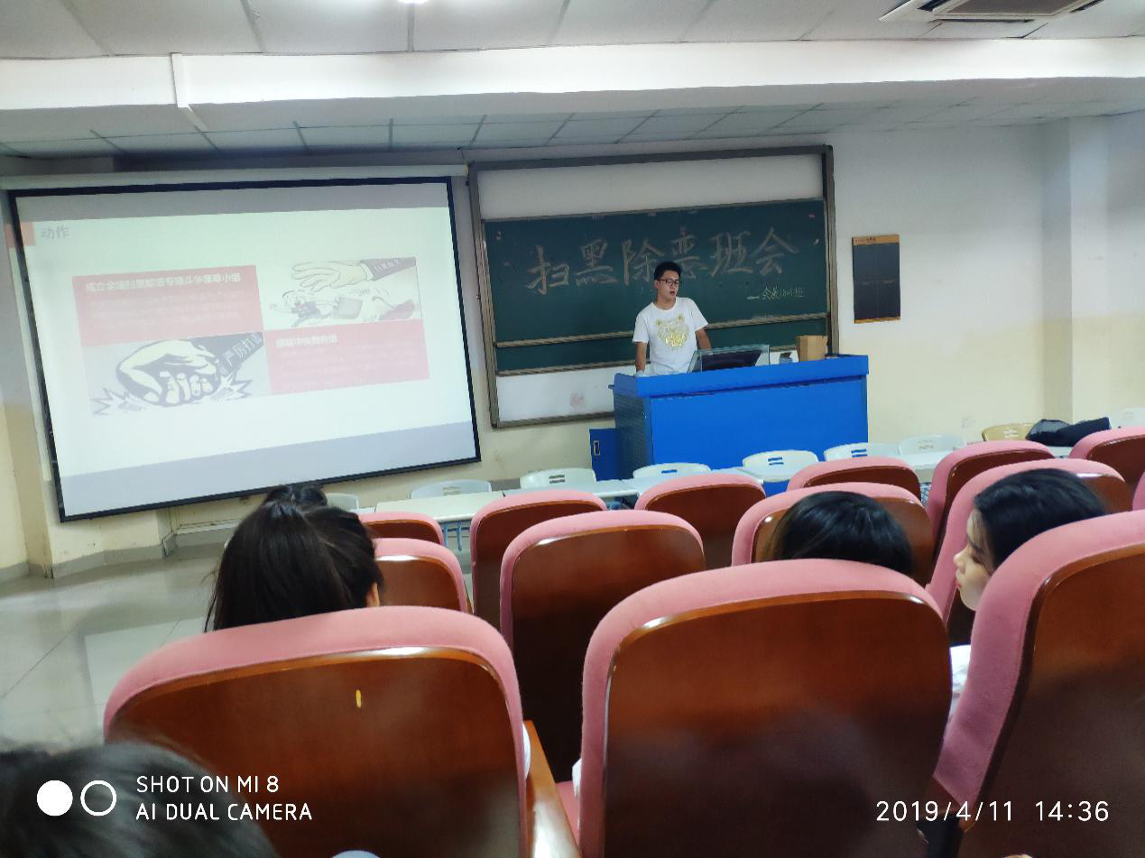 为积极响应国家打黑政策,4月11日,会展经济与管理1801班的全体同学在书知楼1208教室召开了打黑除恶主题班会,由班长刘汝泽担任班会主持。