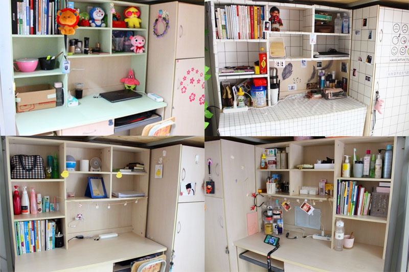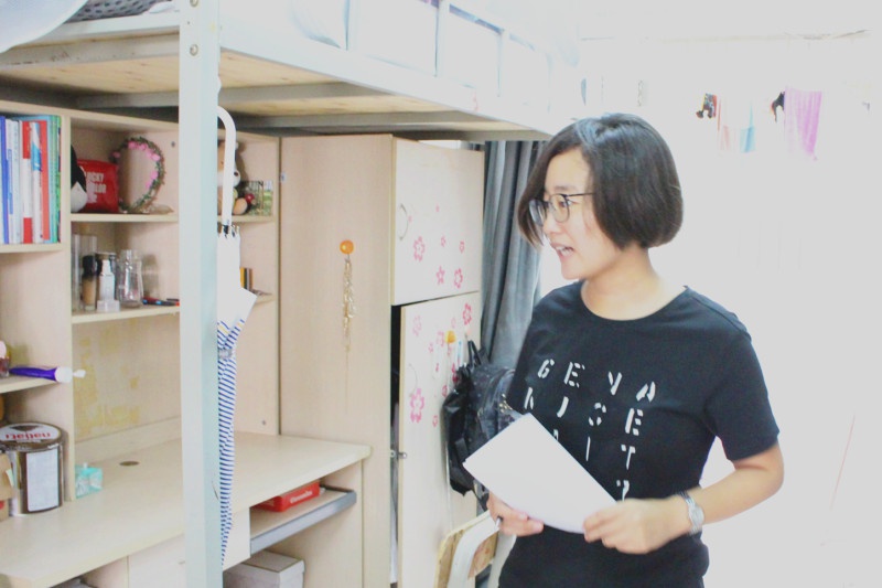 在走访女寝时,祝老师认真审核并根据评分标准给出分数。大部分宿舍以整洁为主,女寝相对突出的有南三123、133,走进南三133宿舍,推开门就被天花板上挂满的树叶所吸引,整体感觉很清新,给人一种放松的感觉。书桌也换上了小清新的“新衣”,一张张挂在书桌上的照片为寝室增添了温馨感。而与之不同的是南三123寝室主题为休闲惬意,方格型的地垫上摆上一个圆形的小木桌,再放上几个简约风格的水杯,使整个寝室具有古典气息。而舒适的小吊坐垫又为宿舍增添新元素。为保持干净,宿舍小伙伴们还统一购买了拖鞋。