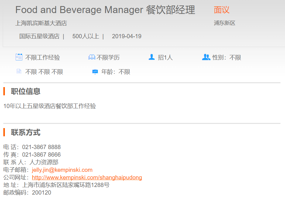 上海凯宾斯基大酒店餐饮部经理
