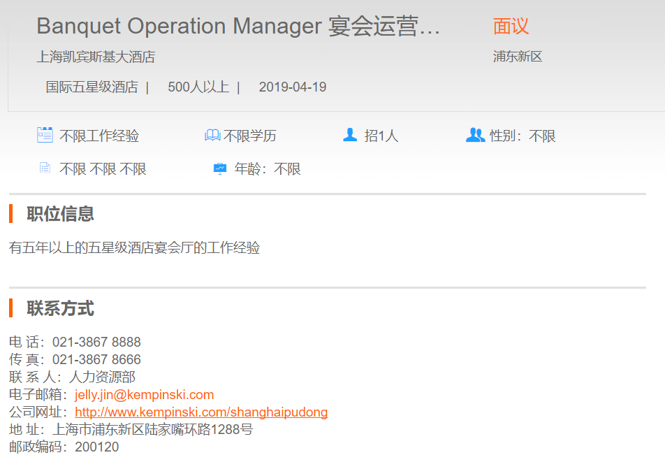 上海凯宾斯基大酒店宴会运营经理