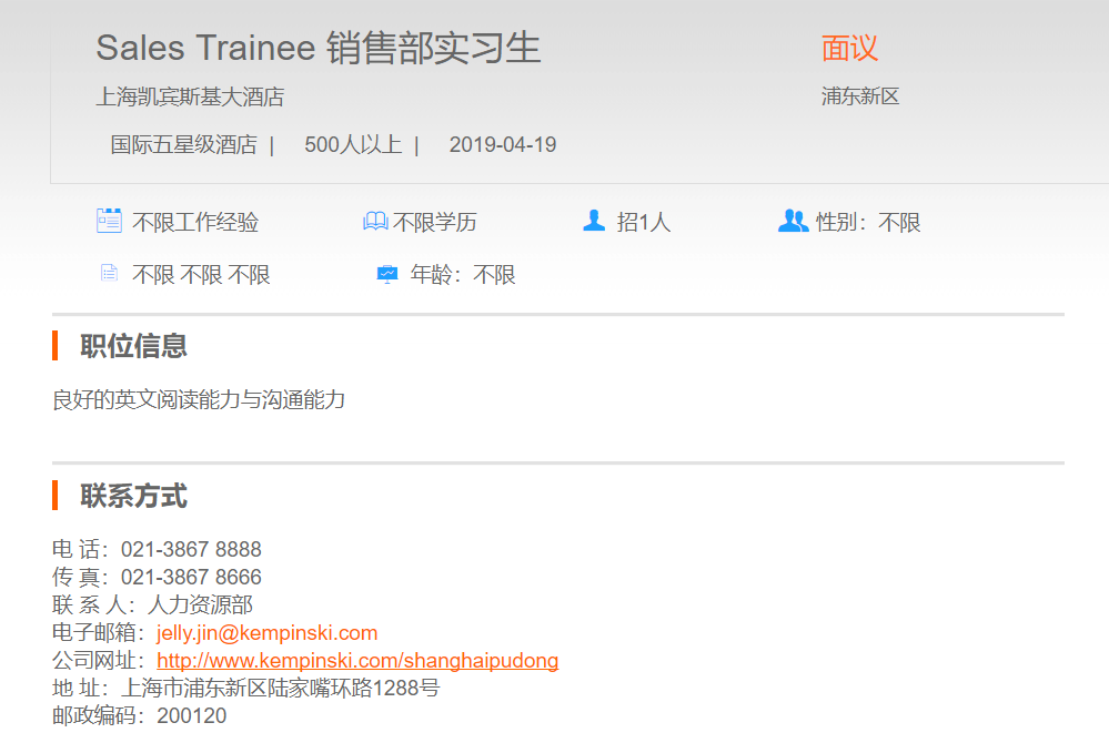 上海凯宾斯基大酒店销售部实习生