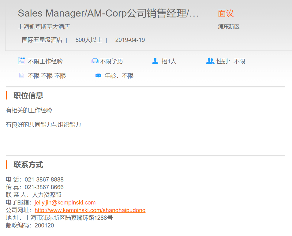 上海凯宾斯基大酒店公司销售经理