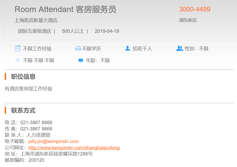 上海凯宾斯基大酒店客房服务员
