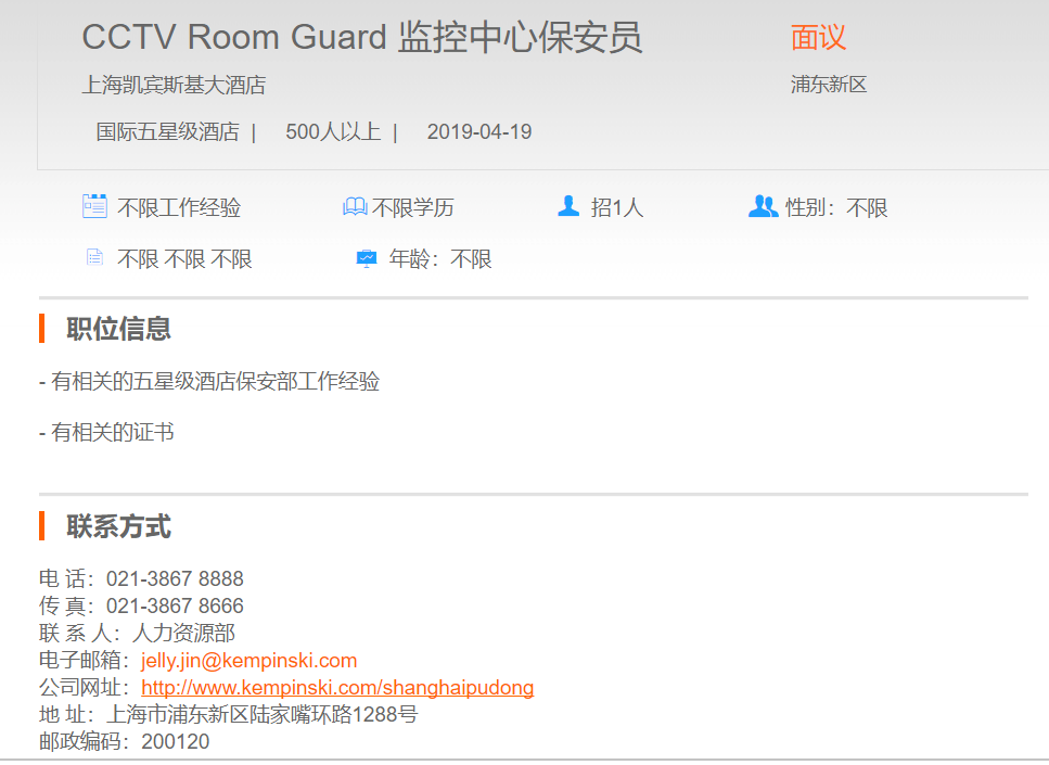 上海凯宾斯基大酒店监控中心保安员