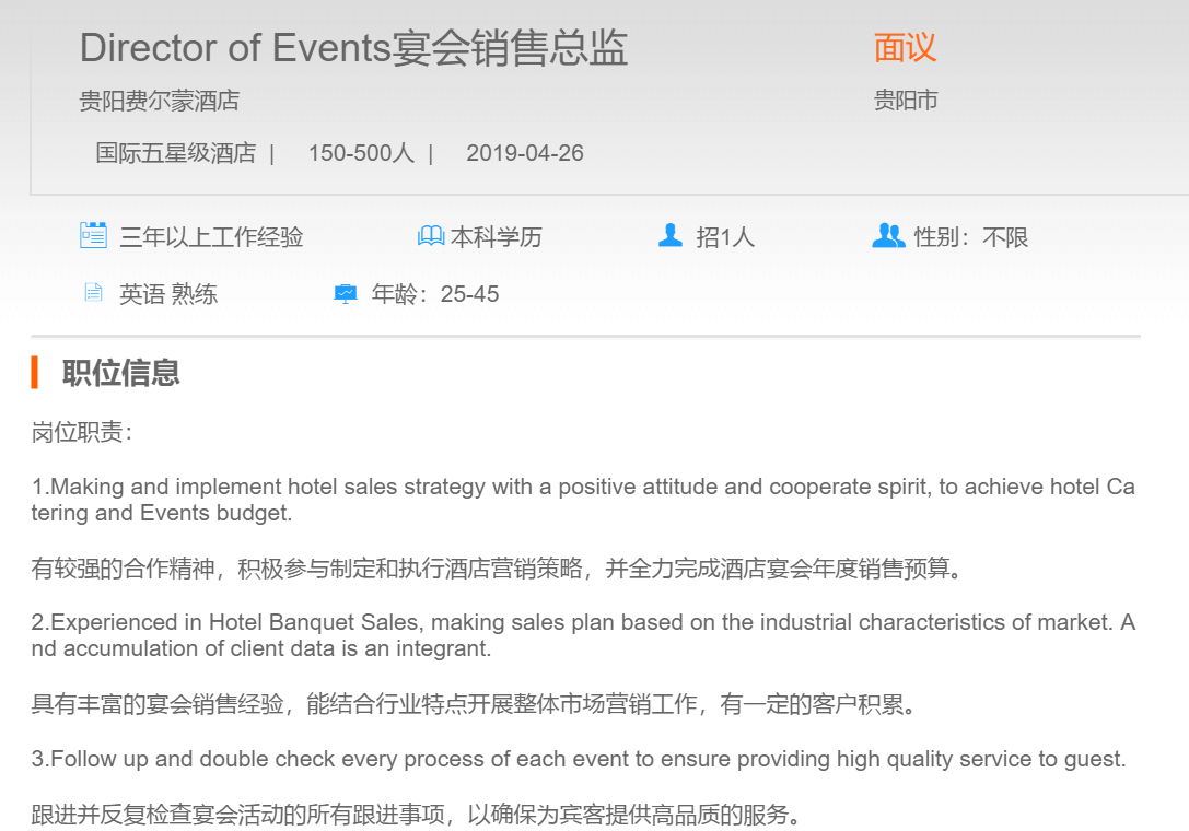 贵阳费尔蒙酒店宴会销售总监