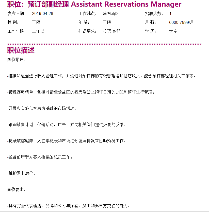 上海滴水湖皇冠假日酒店预订部副经理