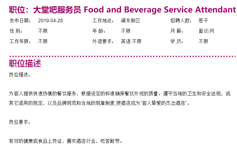 上海滴水湖皇冠假日酒店大堂吧服务员