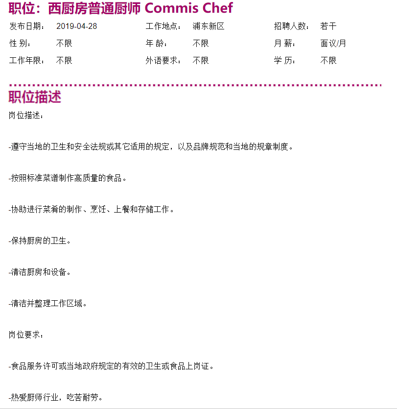 上海滴水湖皇冠假日酒店西厨房普通厨师