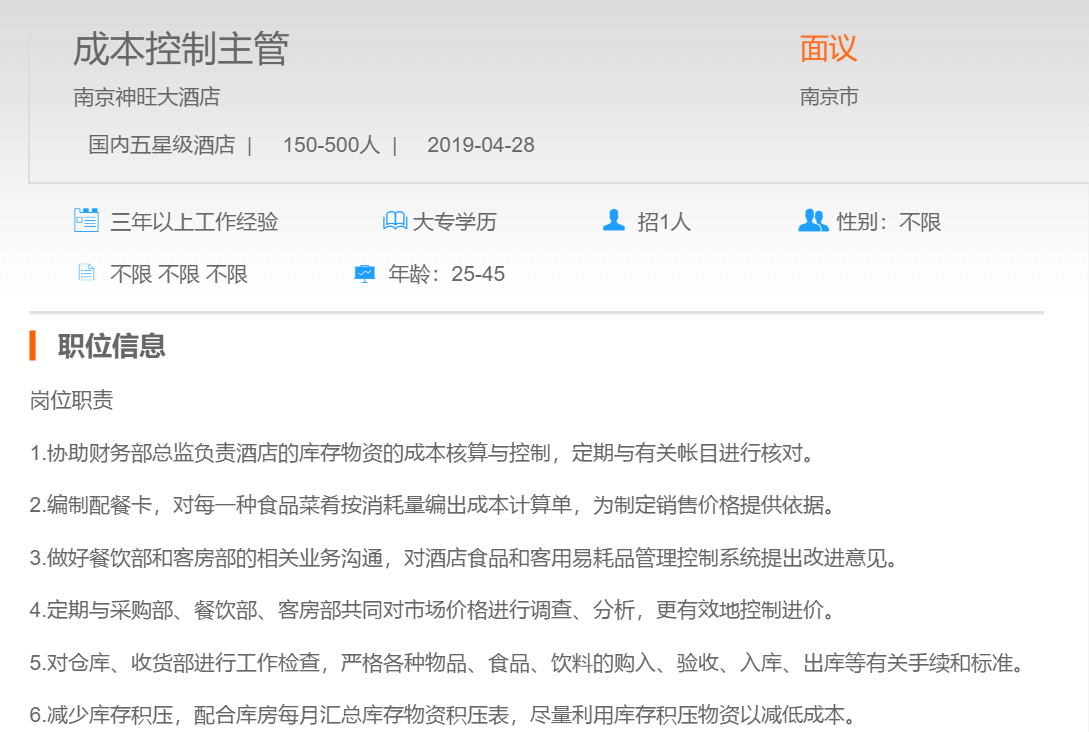 南京神旺大酒店成本控制主管