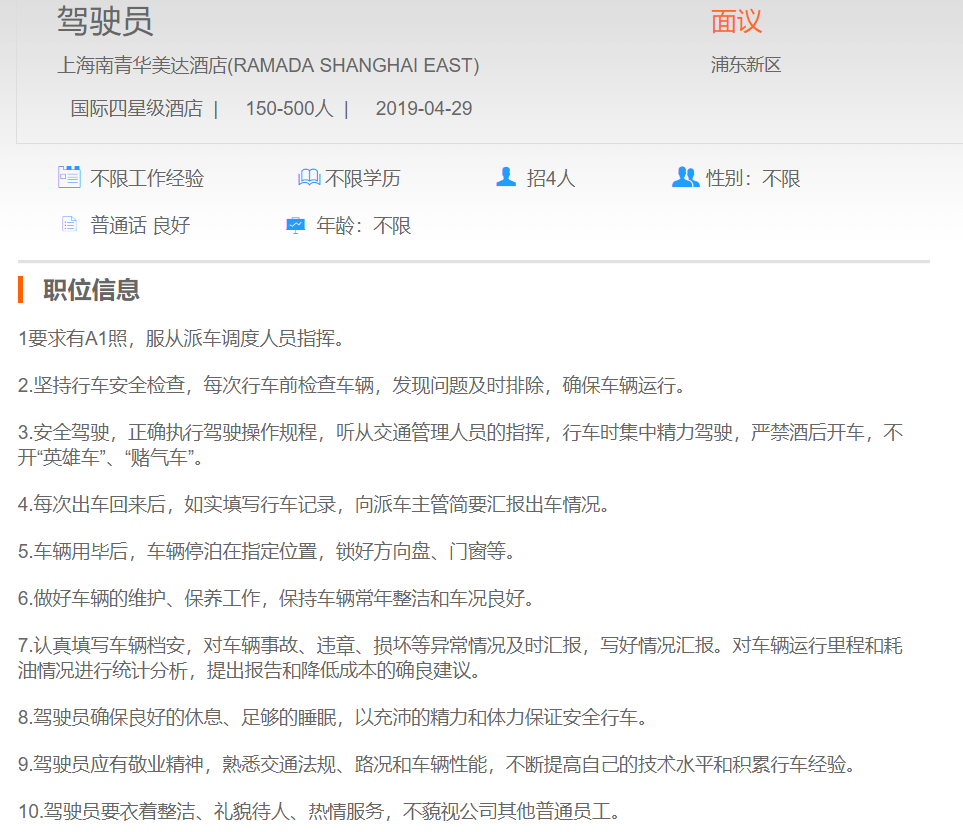 上海南青华美达酒店驾驶员