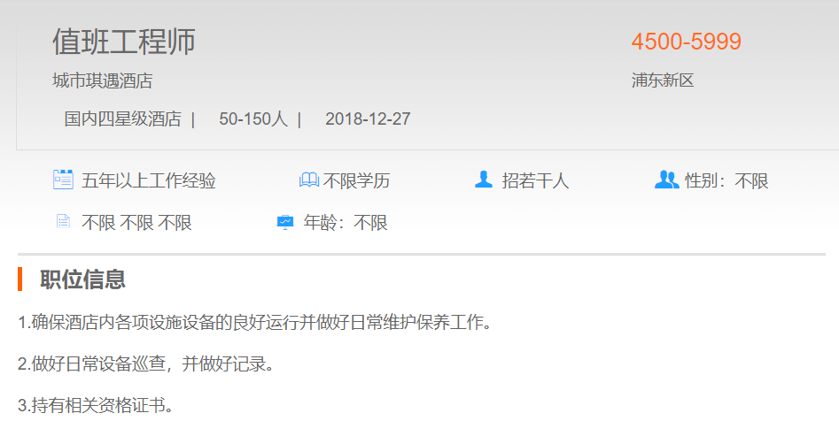 城市琪遇酒店值班工程师