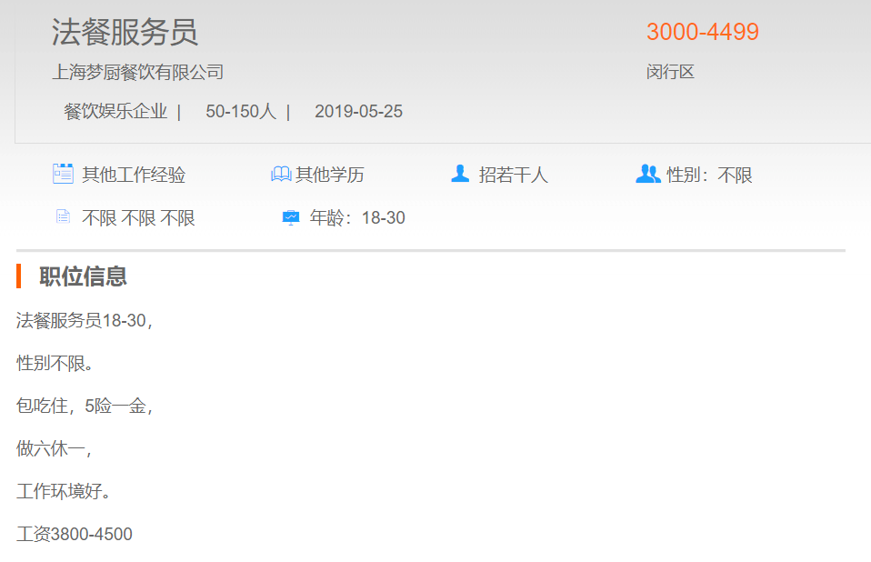 上海梦厨餐饮有限公司法餐服务员