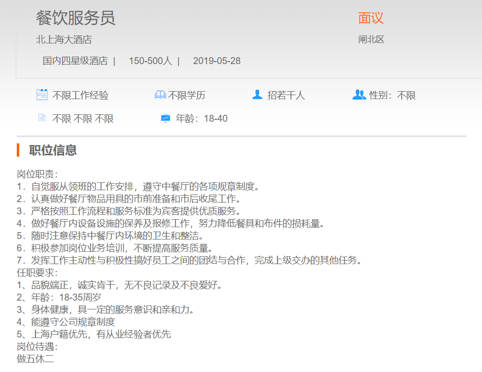 北上海大酒店餐饮服务员