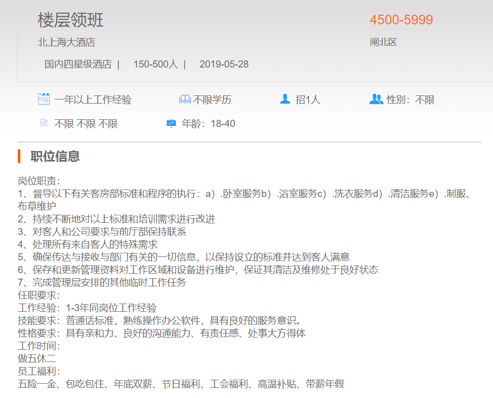 北上海大酒店楼层领班
