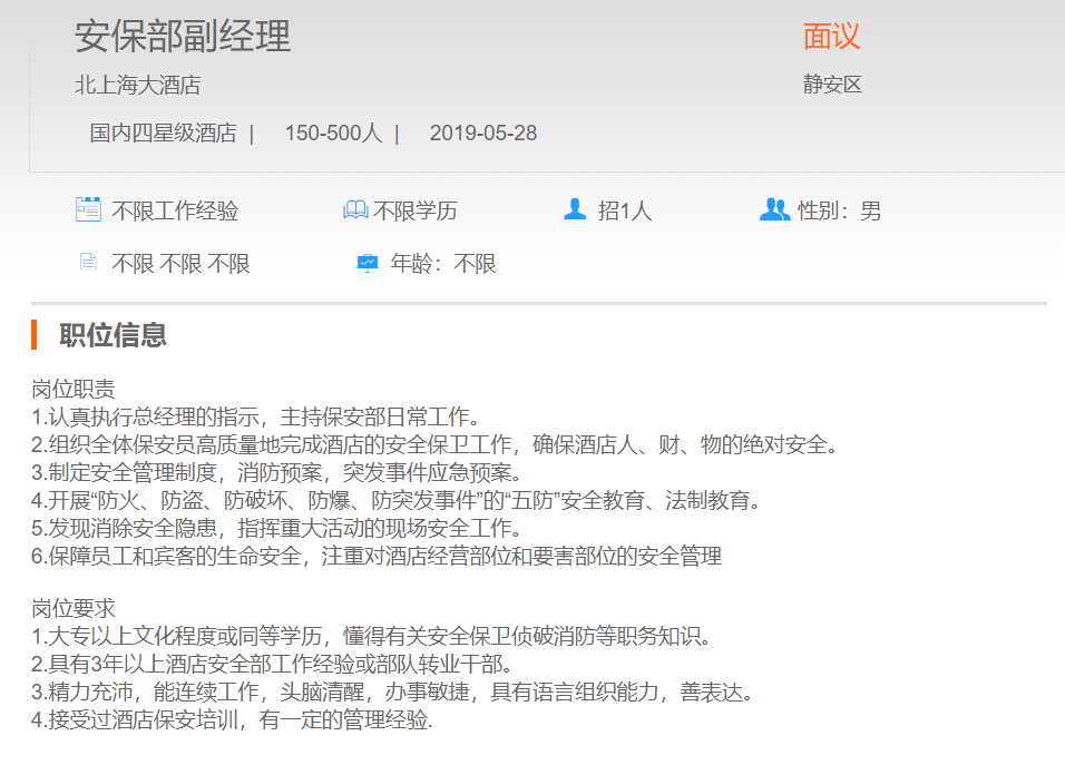 北上海大酒店安保部副经理