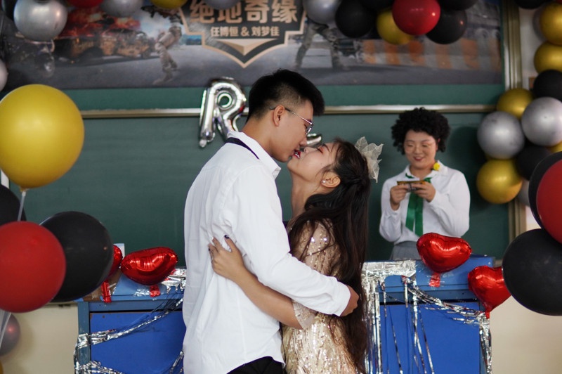 第二组《绝地奇缘,狙击你心》,同学模拟婚礼新人是由于游戏相识,又因为游戏走向婚姻,展示环节创意新颖,符合90、00后的的独特见解。