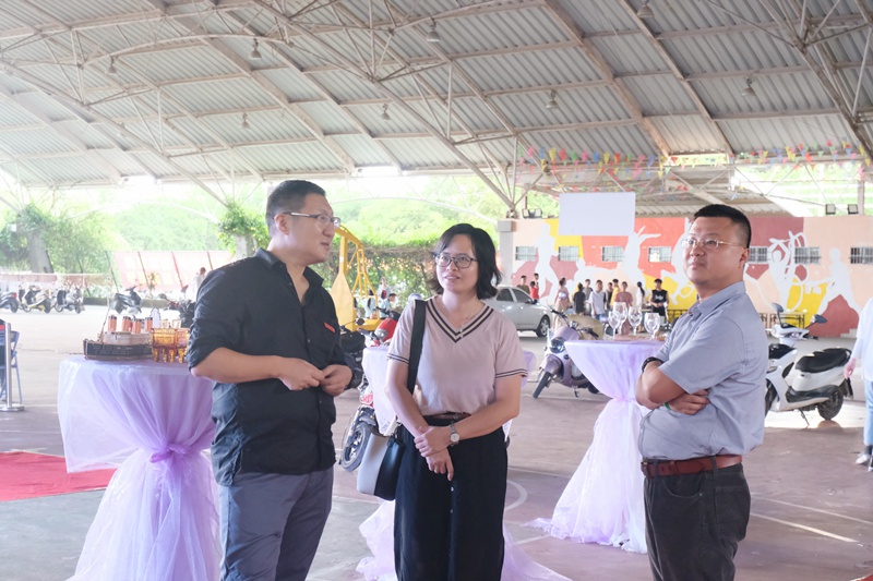 执行经理柴勇、党总支副书记王翔、团委书记吴小柳讨论迎新会场布置