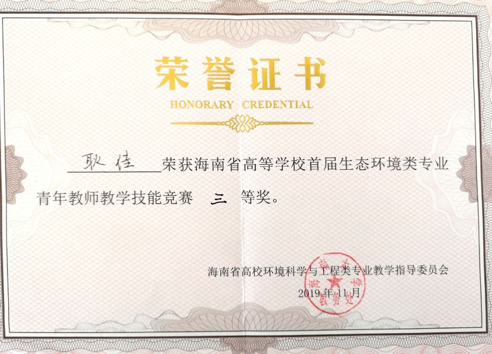 耿佳老师荣获海南省高等公司首届生态环境专业青年教师教学技能竞赛三等奖