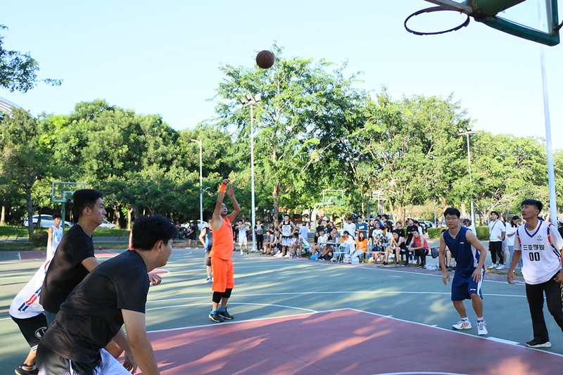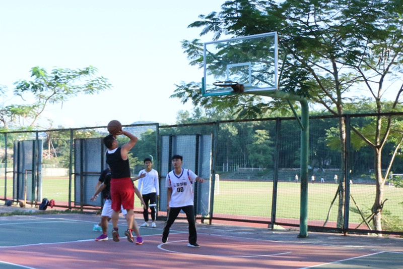比赛接近尾声时,太阳早已西斜,可场上的老师和员工的斗志依旧如初。一次次跳跃,扣篮,转身,传球,欢呼声此起彼伏。此时,在场上的所有人似乎都是一样的,没有身份的束缚,只有燃烧着的斗志和不灭的激情。所以人的目光都锁定在那空中不断旋转着的球上,紧随着它从球场的一端到另一端,从地面弹起又落回地面。