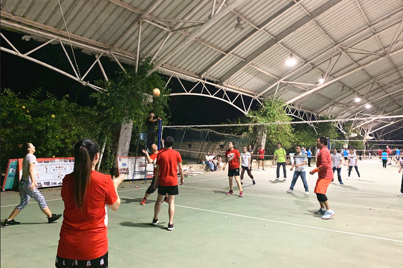 比赛开始之前,公司教职工早早来到球场,进行热身,熟悉球感,达到身体最佳状态。七点三十分整,第一场对战的是管理公司,随着裁判一声哨响,比赛正式开始。公司首发的几位老师以王翔书记为主力,展开了严密的防守。整场节目下来,挑、拨、截、扣教职工运用“十八般武艺”式接球法,引得在场观众拍手叫绝,在公司严密地防守和强势地进攻下,最终公司教职工排球队伍以2:0的优势取得了第一场比赛的胜利。