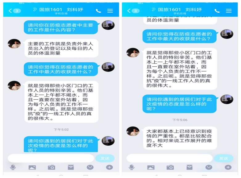 刘科妤主要负责外来人员出入的登记工作以及每日的人员的体温测量,发现体温异常者,及时进行登记、上报。刘科妤觉得小区门口的工作人员特别辛苦,他们基本上一上午都不喝水,而且一直要在室外站着,因为每个人负责的工作都不一样,觉得那些在抗疫一线的工作人员真的很伟大。刘科妤周围的居民基本上意识到疫情的严重性,积极配合工作人员,相对来说工作开展的难度不大,大多数人都能够紧随政府的防控脚步,共同打赢这场攻坚战。