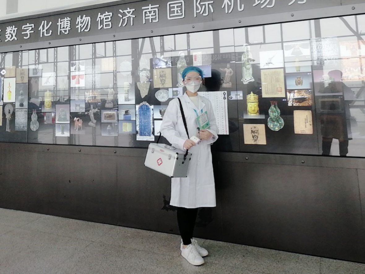 毕业后刘鹏娟回到家乡工作,现就业于济南国际机场,是一名安全检查员,每天忙碌于民航一线。2020年春节来临,刘鹏娟做好了不辞辛苦加班加点保障春运安全的打算,可谁也没想到,一场突如其来的疫情,武汉封城、全国人民隔离居家、航班量突然下降,整个机场、整座城市、甚至我们的国家安静了下来。援鄂医疗队出征仪式上白衣天使们那一句句不战胜不归还的誓词,深深打动着刘鹏娟。作为一名民航一线员工安全检查员,即使休假期间,她仍然选择留在候机楼做志愿者,为战疫尽绵薄之力,参与援鄂医疗队的专机保障任务。