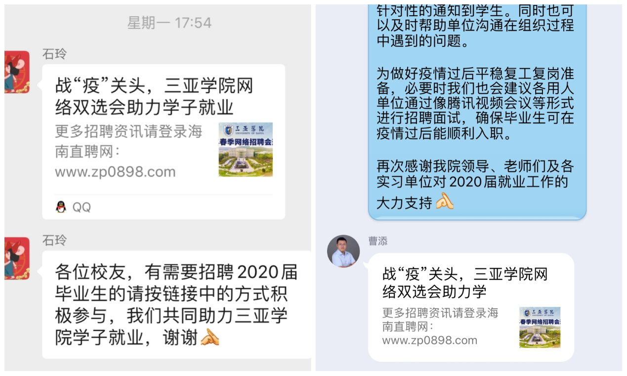 在这个特殊时期,公司思想导师们始终坚持“就业服务不打烊、线上招聘不停歇”,对毕业生全面摸排、分类引导,尽自己最大的努力为毕业生分忧解难。