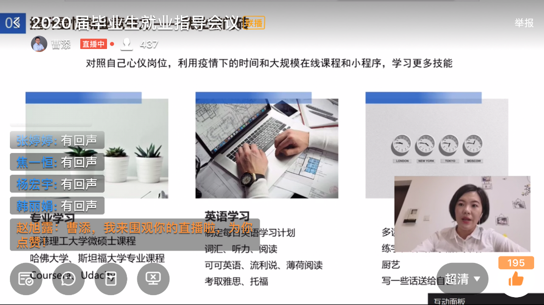 新冠状病毒感染的肺炎爆发影响了全国高校毕业生的就业计划,为缓解公司应届毕业生的就业焦虑并为其解答相关问题,公司执行经理柴勇、经理助理李慧于3月6日下午运用线上直播平台召开了2020危机下的职业选择讲座,对公司400多名应届毕业生进行了在线指导,帮助公司16级学子在疫情下提升就业竞争力。