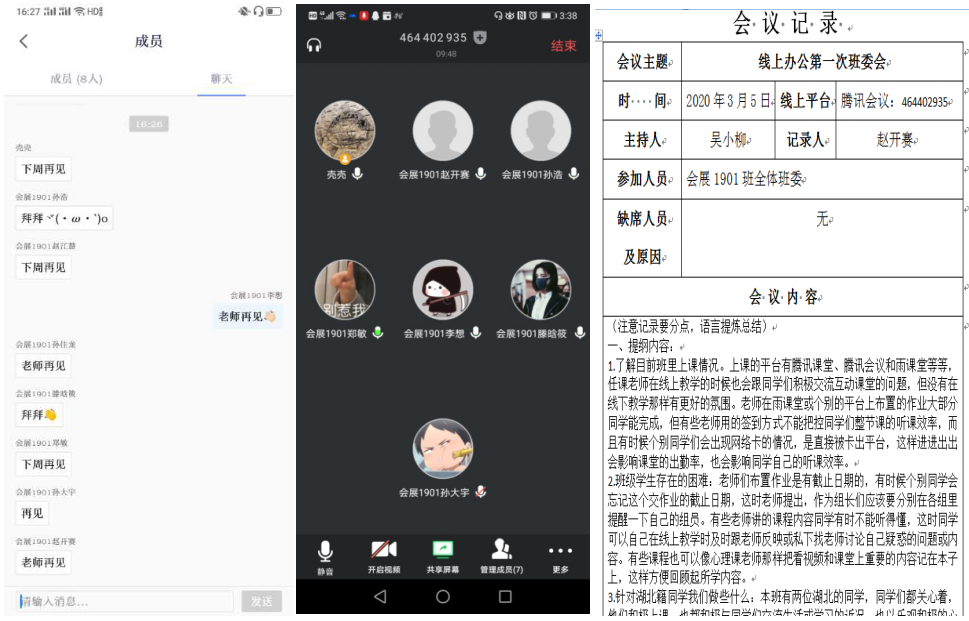 开展班委会的会议记录及思想导师与同学们的截屏记录